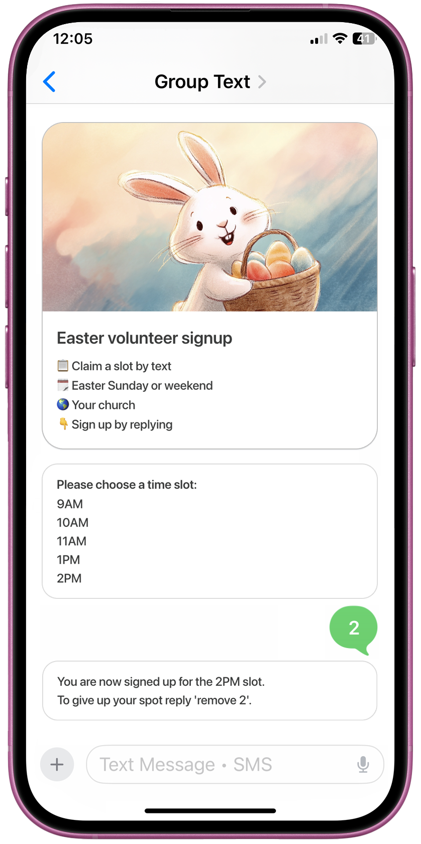 An Easter volunteer signup by text is a church volunteer signup sent through text message instead of a webpage or spreadsheet. Volunteers receive the signup in a text thread, reply to claim a role or time slot, and get confirmation and reminders by text.